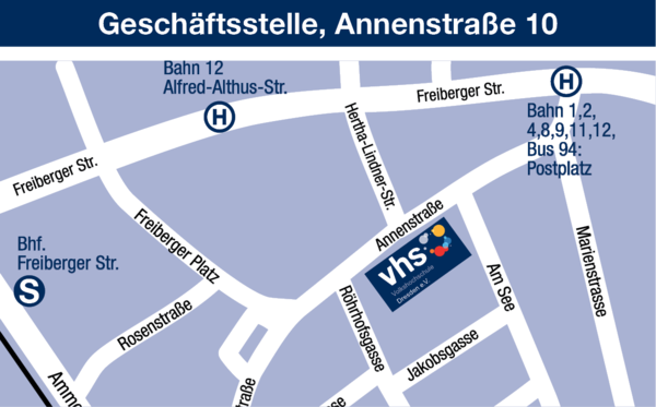 Kommen Sie dafür bitte in die Annenstraße 10. Das ist am Postplatz. Die Volkshochschule in der Annenstraße 10 ist Montag bis Mittwoch von 09.00 bis 12.00 Uhr geöffnet. Am Donnerstag ist die Volkshochschule nachmittags von 15.00 bis 18.00 Uhr geöffnet. Außerdem hat die Volkshochschule Dresden noch einen weiteren Stand-Ort.